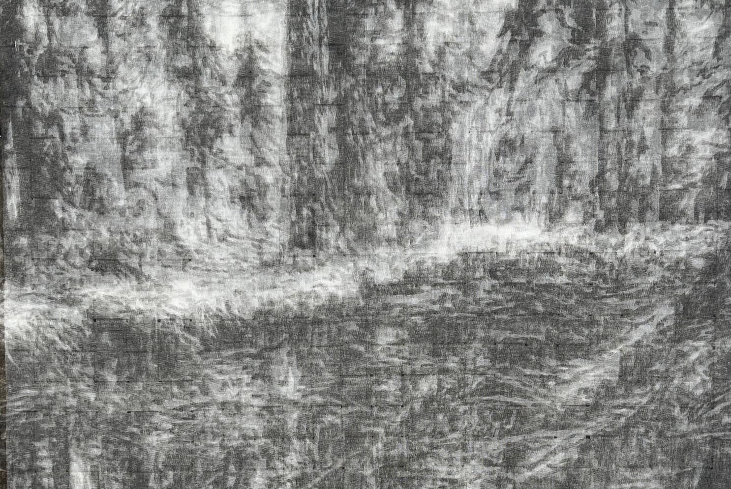 Iveta Šmita. “Darbs I” no cikla “Mežs”. Autortehnika: kaligrāfijas tuša, zīds, lins. 70 x 50 cm (fragments). 2025.