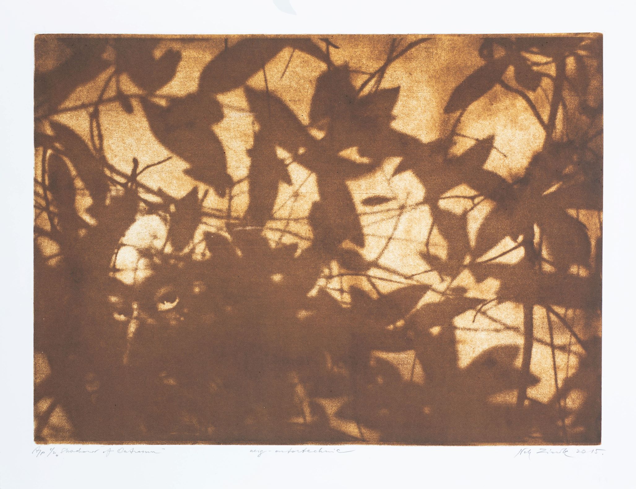 Nele Zirnīte. “Rudens ēnas”. Papīrs, oforts, linogriezums. 50 x 65 cm. 2015.