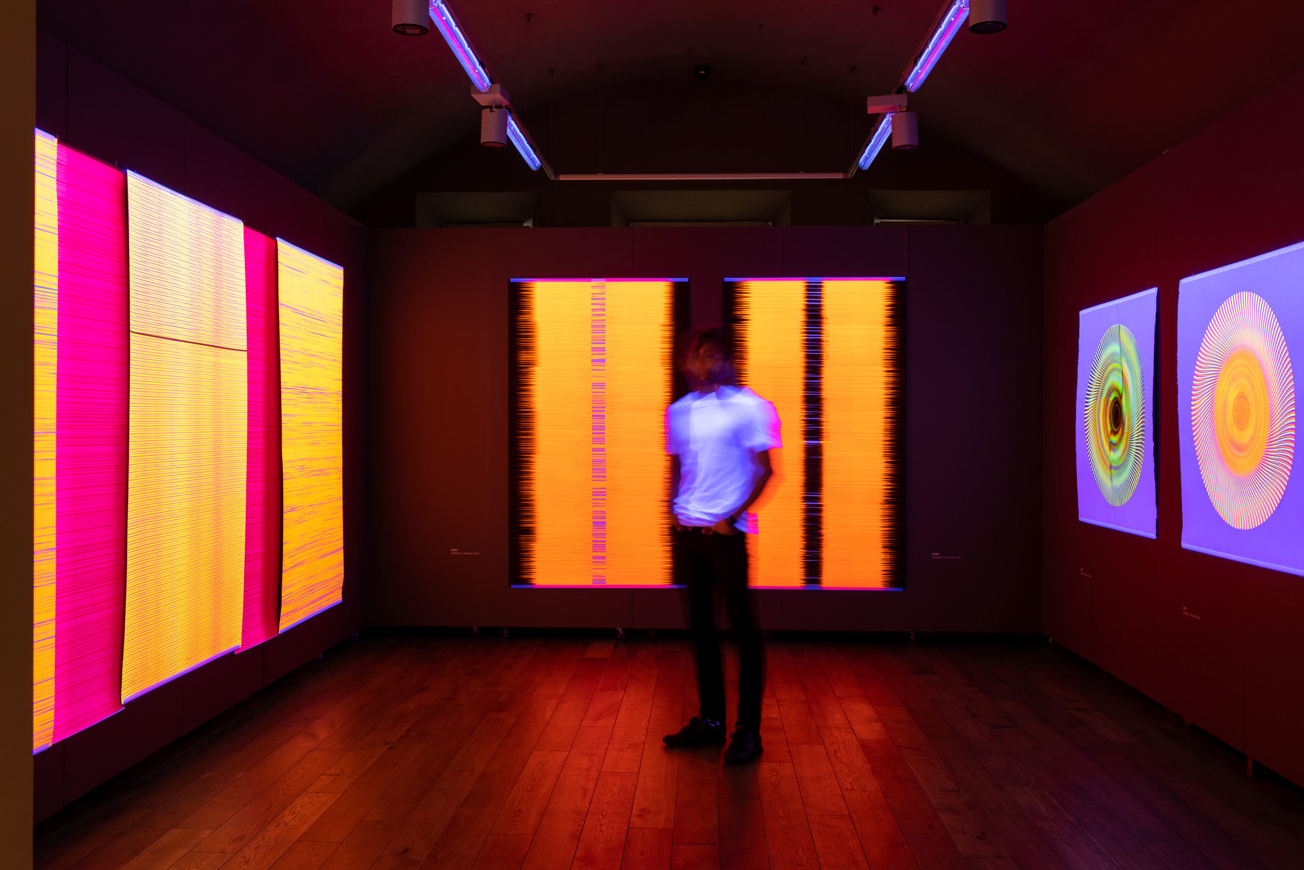 “Manu “Interferenču” ciklu veido abstraktas kompozīcijas ģeometriskā viļņveida rakstā. Ierobežots skaits krāsu un grafikas matriču ļauj radīt teju neskaitāmus darbus. Vairākkārtīgos pārklājumos slāņotās ondulējošās matrices aicina vilkt asociatīvas paralēles ar vibrācijām un ceļojošiem skaņas viļņiem. Abstrakti reprezentatīvās grafikas mudina domāt par to, kā viens notikums var iedarboties uz citu; kā pat šķietami nelielas iejaukšanās var jūtami ietekmēt tiklab attēlus, kā dzīves situācijas.”
