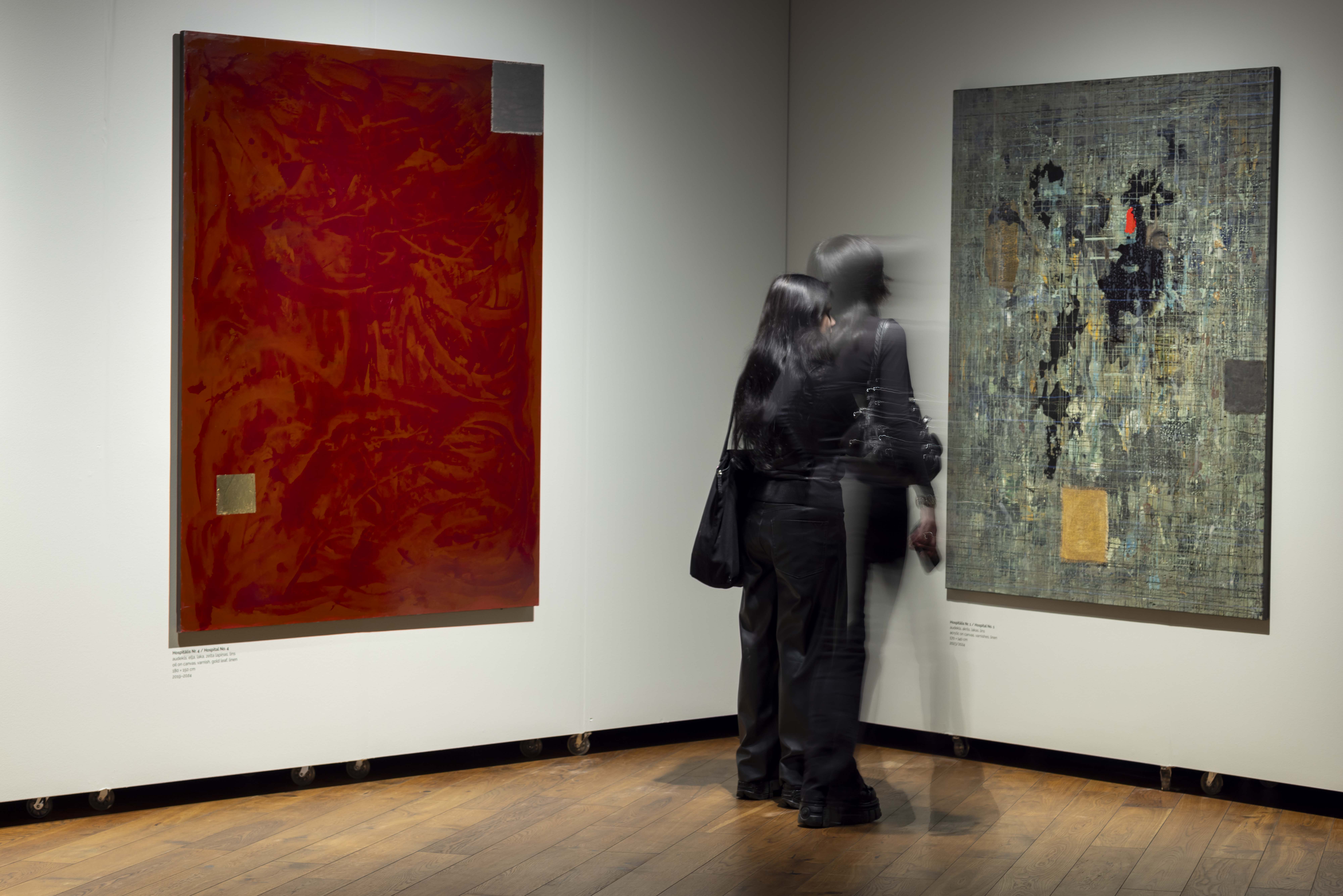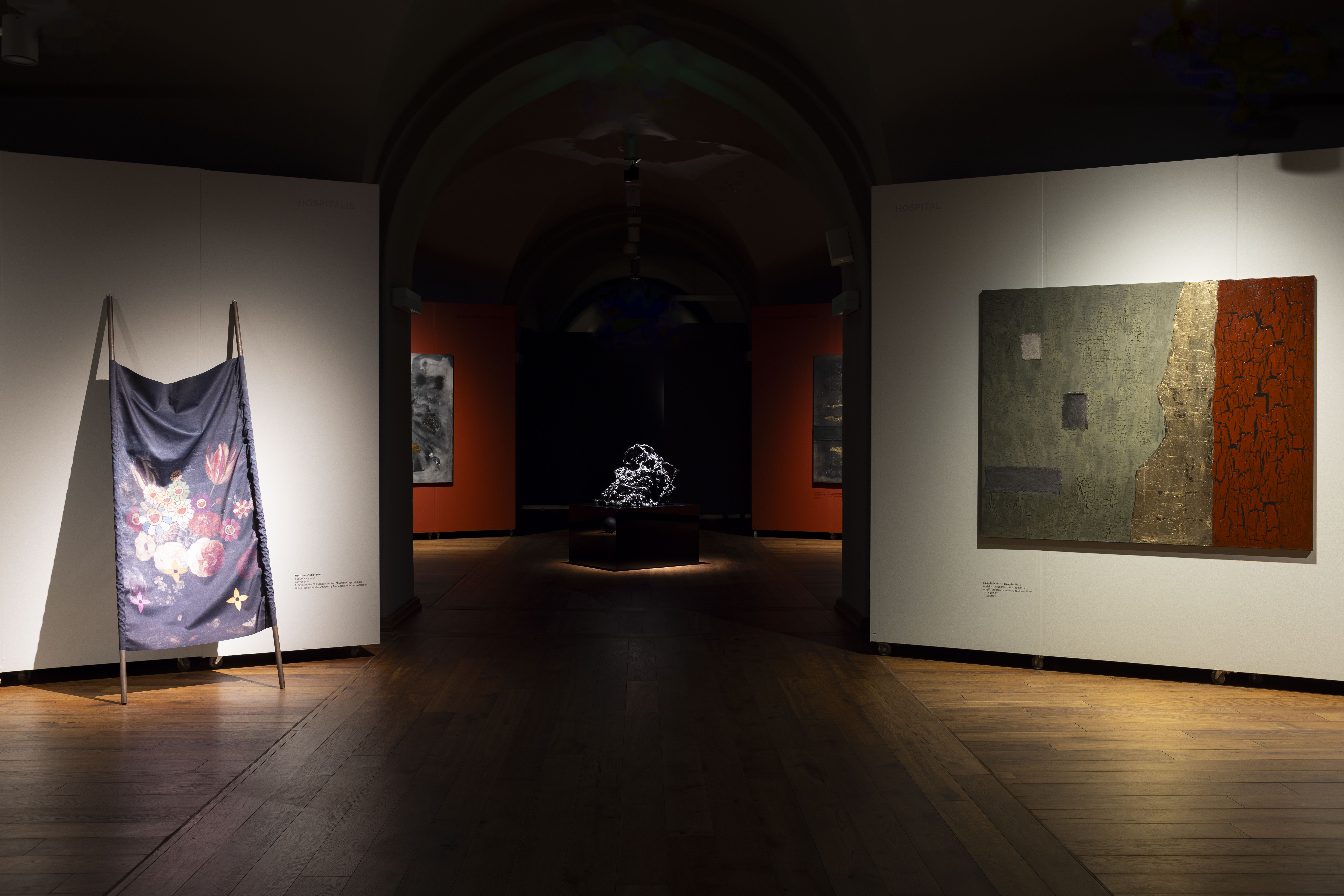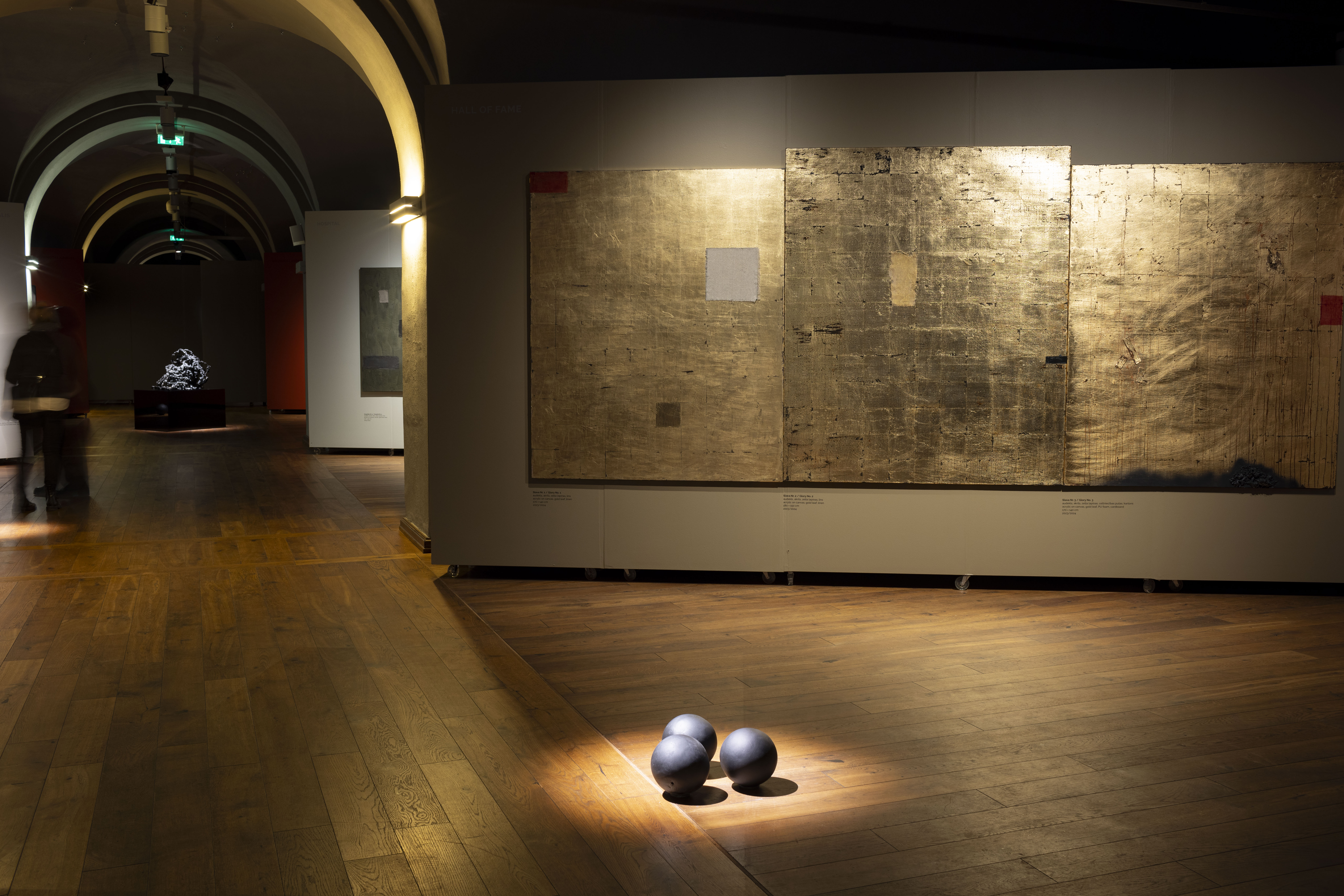 In visual terms, the exhibition has developed from a single artefact – a flaming cannonball once spotted on the local fortress gate. This striking visual impulse sparked the entire Bastion Series with its distinctive textures and creative pulse, from the initial choice of themes and colours up to the final sectioning of artworks in the exhibition rooms. The exhibition layout tells the viewer a cohesive story about the glory of victorious triumph, the overcoming of defeat, and growing strong through healing battle wounds. From the triumphal Hall of Fame with streaming battle flags and shining gold leaf through the clinical hospital space with its bandages, stretchers and trauma shown through deconstructive planes and multiple chromatic layers, to the incinerated wasteland of the Wounded Landscapes – a former battleground reduced to ashes and decaying fragments in assorted shades of black.