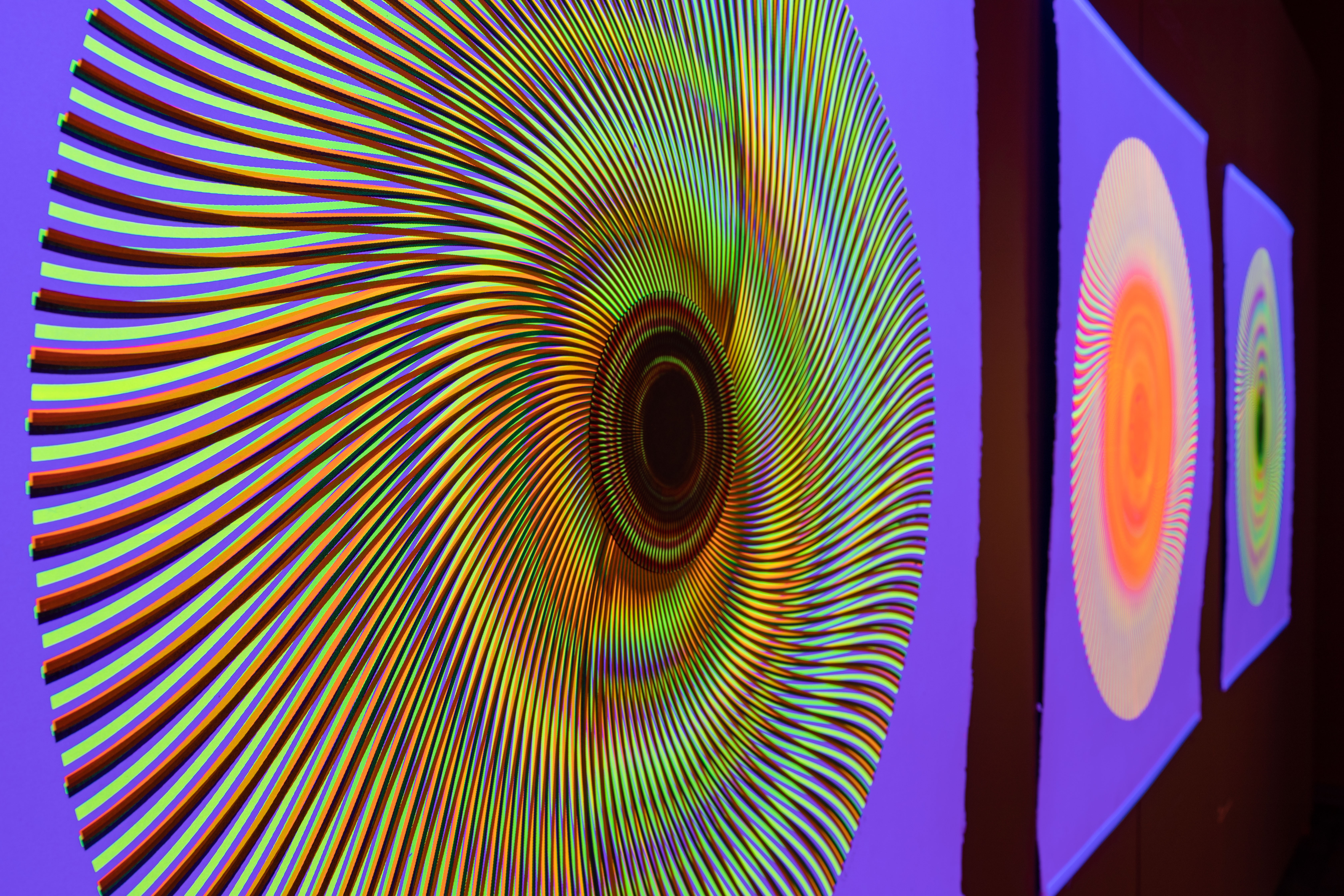 “My “Interferences” series consists of abstract graphic compositions with geometric, wavelike patterns. From a finite number of colours and matrices, I am able to create innumerable graphics. The images are made from superimposed undulating matrices and trigger associations with vibration patterns and travelling sound waves. These graphics are also an abstract form of representation, suggesting how one event can impact on another; how even minor disruptions can interfere with an entire image or situation.”