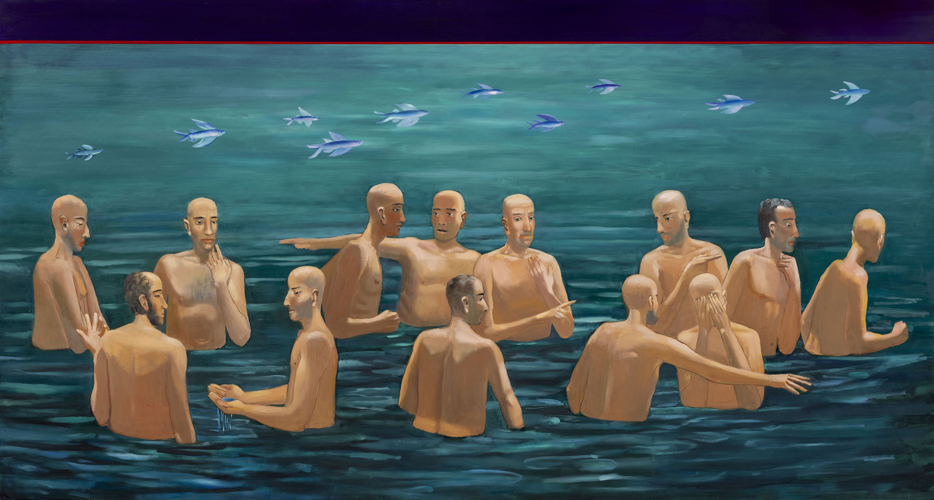 Kaspars Zariņš. “Assembly I”. Oil on canvas (detail). 150 x 280 cm. 2025.