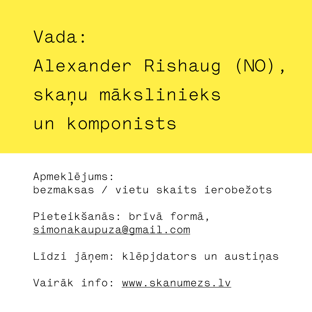 Eksperimentālās mūzikas festivāls Skaņu mežs aicina jauniešus piedalīties meistarklasē, kas palīdzēs iegūt iemaņas darbā ar ierakstu tehniku, kā arī iepazīstinās ar vienkāršu kompozīciju veidošanas pamatiem. Meistarklasi vadīs skaņu mākslinieks un komponists no Norvēģijas – Aleksandrs Rishaugs. Aleksandrs darbojas eksperimentālās mūzikas un laikmetīgās mākslas krustcelēs. Viņa darbi nereti ir konkrētām telpām radītās instalācijas, tāpat viņš ir strādājis arī kino, teātra un laikmetīgās dejas sfērā. Meistarklases dalībnieku radītās skaņas tiks ierakstītas, un to fragmenti oktobrī tiks izmantoti jaundarbam, kas tiks atskaņots festivāla Skaņu mežs koncertā.
